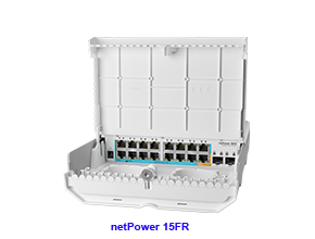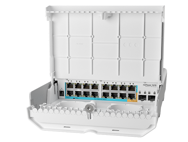 An outdoor 18 port switch with 15 reverse PoE ports and SFP